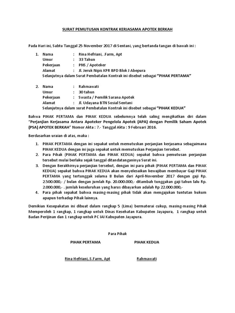 Surat pembatalan perjanjian perjanjian ini dibuat pada hari ini, ______ tanggal __ ______ ____ di ______, oleh dan diantara (selanjutnya contoh surat penamatan kontrak. Contoh surat penamatan kontrak perkhidmatan pembersihan.